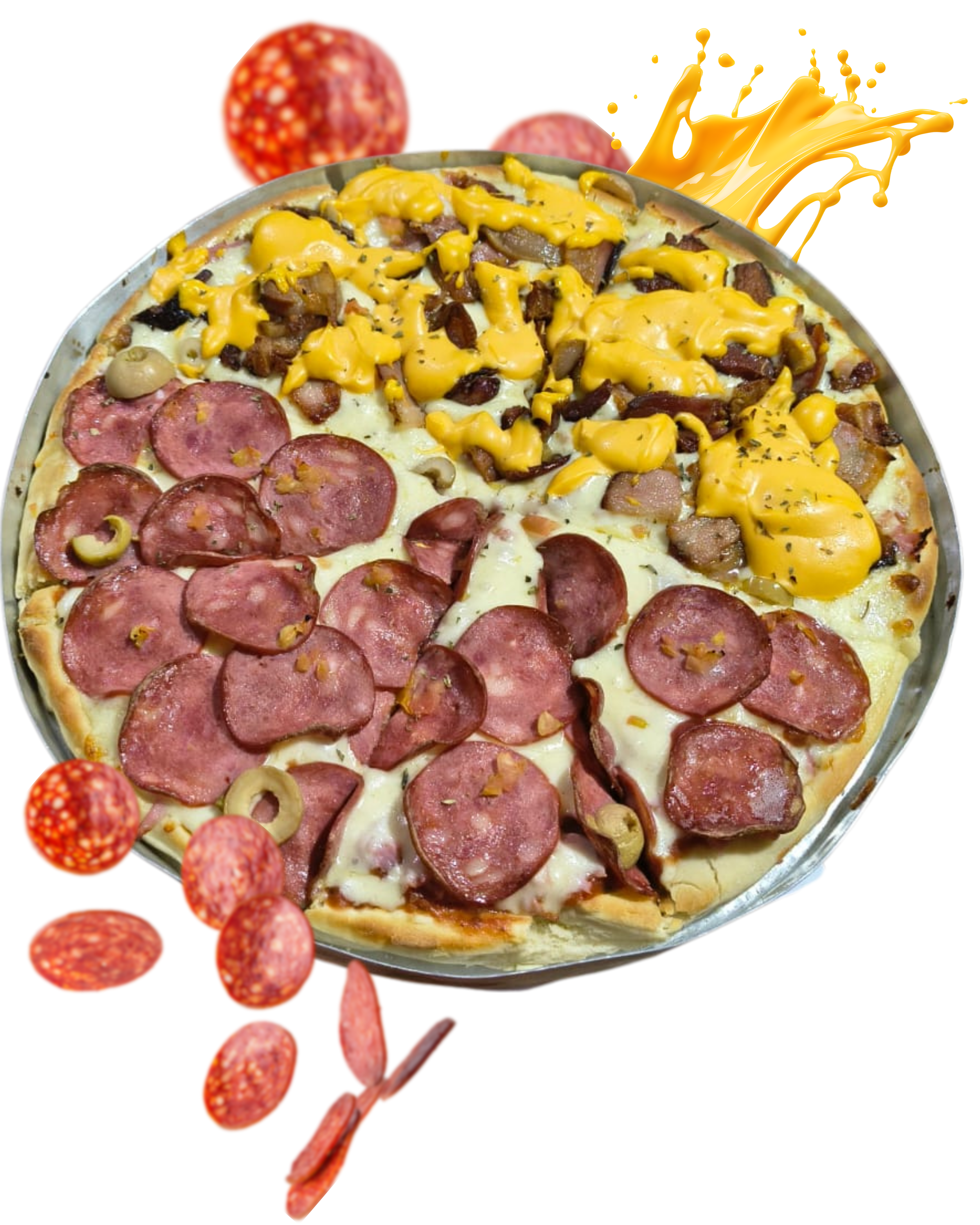 Mussarela, calabresa, bacon, presunto, tomate, azeitona, molho e orégano