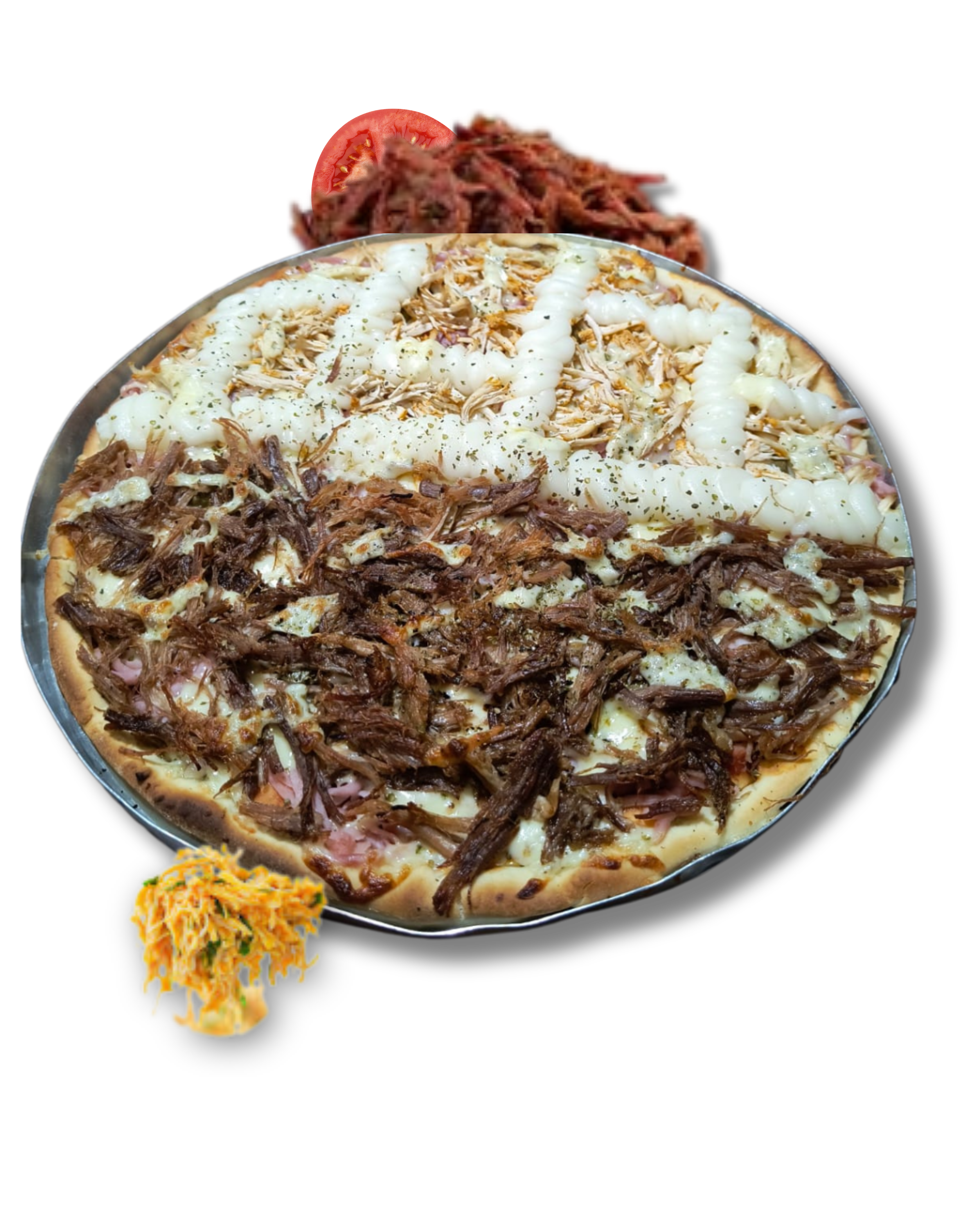 Mussarela, carne de sol, catupiry, presunto, tomate, azeitona, molho e orégano