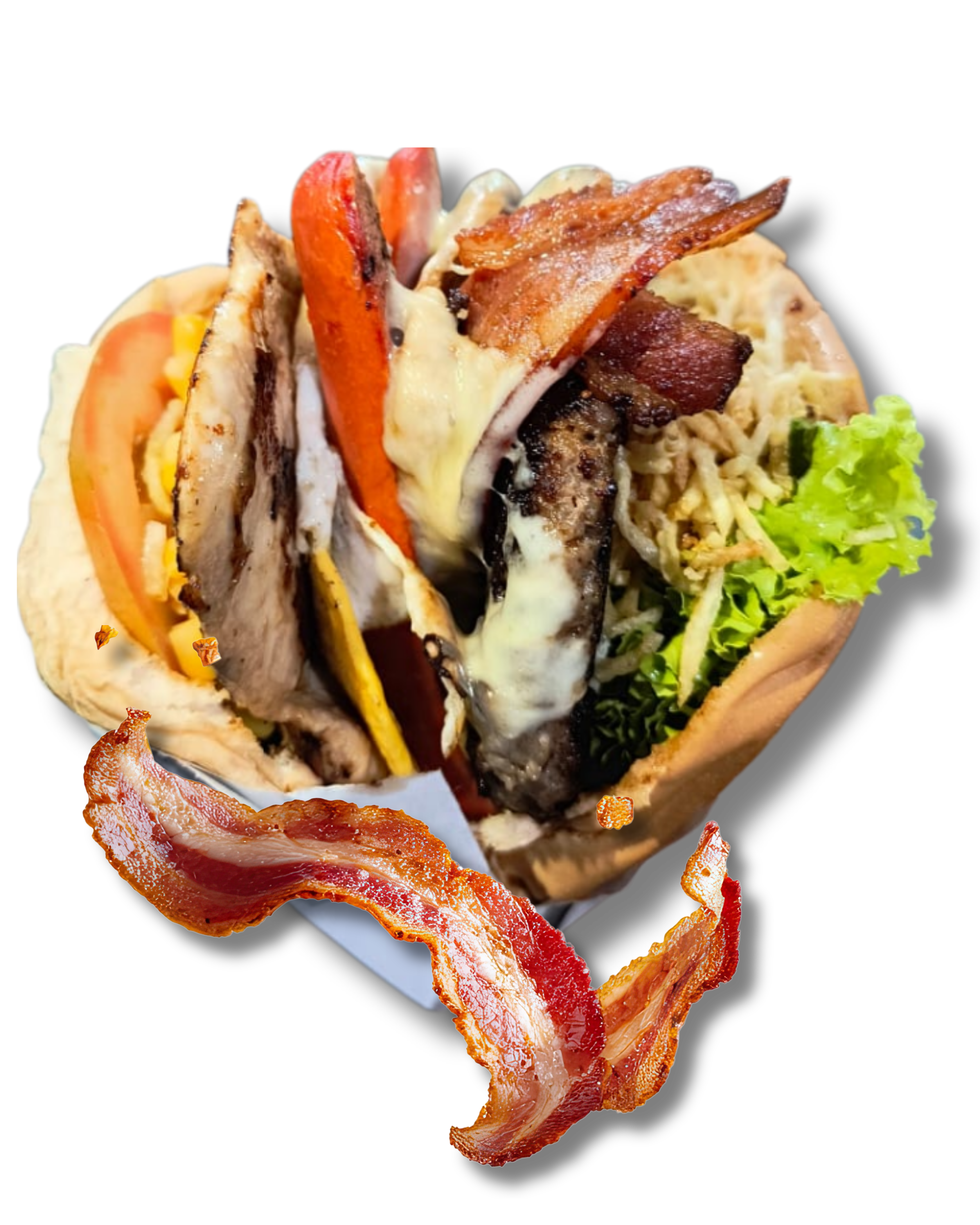2 frango ou lombo, 4 bacon, 2 ovos, catupiry, mussarela, alface, tomate e milho.